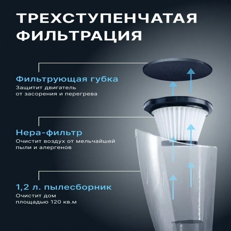 Большие колеса, Вертикальная парковка, Горизонтальная парковка, Индикатор заполнения пылесборника, Контейнер длянасадок, Управление на рукоятке