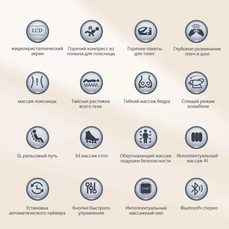 • Массажное кресло – 1 шт. • Планшет управления – 1 шт. • Держатель планшета управления – 1 шт. • Адаптер питания – 1 шт. • Руководство по эксплуатации – 1 шт. • Гарантийный талон – 1 шт.