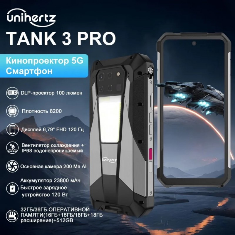 Основная информация: 8849 Танк 3 Pro================================Функции:Процессор -- MTK Размерность 8200Аккумулятор --23800 мАчОперативная память + ПЗУ --32 ГБ/36 ГБ (16 ГБ/18 ГБ + 16 ГБ/18 ГБ виртуальной оперативной памяти) + 512 ГБ/поддержка TF-карты макс. 2 ТБDLP-проектор, 100 люмен, 120 Гц, светодиодный наружный свет и красный синий светАндроид 13.0Дисплей --6,79 дюйма FHD+1080*2460Частота обновления 120 Гц/Wi-Fi 6Другие --Bluetooth 5,3, GPS+ГЛОНАСС+Beidou+Galileo (GPSL1+L5)Фронтальная камера-камера 50MP FFЗадняя камера — камера AF 200 МП/камера ночного видения 64 МП/широкоугольная камера 50 МПСертификация -- IP68/GMS/FCC/CE/MIC/ICРазмер: 179*86*29,8 ммВес смартфона: 696 г